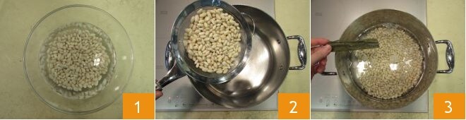 To prepare the fake veg ramen, start with the cannellini bean broth. These need to be rehydrated for 24 hours, so soak them in fresh water 1. The next day, drain, rinse them, and place them in a large pot 2. Cover with plenty of fresh water and add the kombu seaweed 3.