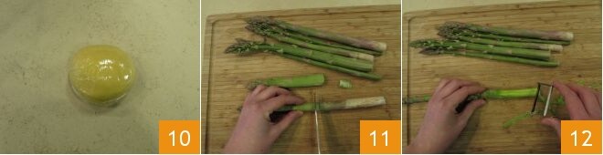 Finally, wrap the dough ball in plastic wrap and let it rest for at least 30 minutes at room temperature 10. During this time, you can work on the vegetables. Start with the asparagus: trim the woody part 11 and then peel the rest using a peeler 12.