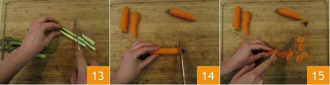 Cut them in half lengthwise and then into 1-inch pieces, slicing diagonally 13. Move on to the carrots. These should also be peeled and trimmed 14, and finally sliced into rounds, about 1/8 inch thick, on a diagonal cut 15.
