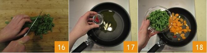 Finish with the sugar snap peas. After rinsing, trim them and cut them diagonally into 3/4-inch pieces 16. Move to the stove. Heat a pan with some oil. Heat it along with cleaned and crushed garlic and then the chili peppers 17. Add the carrots, sugar snap peas 18,