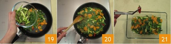 and then the asparagus 19. Season with salt and pepper and sauté over high heat for 4-5 minutes, stirring occasionally 20. Finally, transfer the vegetables to a bowl, removing the garlic and chili peppers 21.