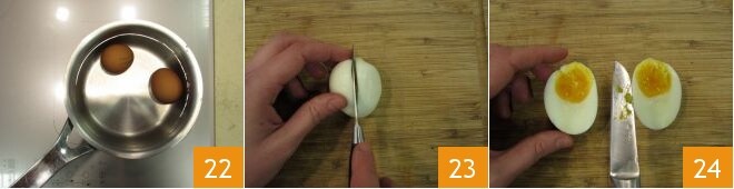 Meanwhile, boil the eggs; these are not the classic Hard Boiled Eggs, but rather soft-boiled. This means that the white will be fully cooked while the yolk is slightly creamier. So immerse them in a saucepan with plenty of water 22. After 6-7 minutes from when the water starts to boil, turn off the heat and cool briefly under running water. Then peel and cut in half with a smooth knife (23-24).