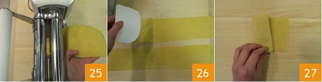 At this point, you have everything ready, so return to the fresh pasta. Take it and, after lightly flouring it with a pinch of semolina, pass it through a pasta machine. It's better if you start by cutting a few pieces of pasta instead of using the whole dough. Then pass the dough through the rollers starting from the widest setting until reaching the second to last (for our machine, this is number 7). Pass the same strip of pasta through two more times, so the sheet will be compact 25. Then cut the sheets to get rectangles and let them dry in the air for a few minutes 26. Sprinkle with semolina and fold a couple of times 27.