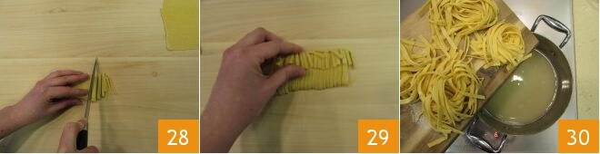 Finally, cut into strips of 1/8 inch 28 and unravel 29 forming nests. When all the nests are ready, proceed with cooking them in the blended bean broth that you have brought to a boil 30.