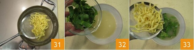 Cook the tagliolini for 2-3 minutes 31. In the dishes, pour some of the broth along with thinly sliced chard leaves 32. Then add the pasta 33.