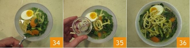 And garnish with half an egg and a few spoonfuls of the sautéed vegetables 34, then the cleaned and sliced scallion 35, and finally garnish with a pinch of black pepper. Your fake veg ramen is ready, enjoy 36.