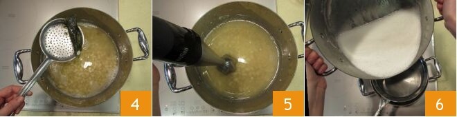 Let the beans simmer for about 75 minutes, making sure they are sufficiently soft. Then remove the seaweed 4 and season with salt. Blend everything 5 and strain to obtain a sort of broth; keep it warm by adding more water as needed 6.