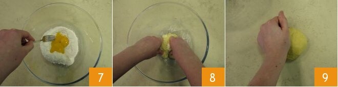 In the meantime, you can focus on the fresh pasta. Break the eggs into a bowl where you've poured the flour and, using a fork, start mixing 7. When it gets thicker, use your hands 8 and transfer it to a work surface, kneading for a few more minutes. If needed, you can add a pinch of flour 9.