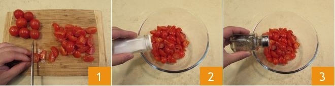 To prepare the farfalle with salmon, arugula, and cherry tomatoes, start by cutting the cherry tomatoes into 4 parts 1, then add the salt 2, the pepper 3
