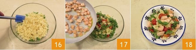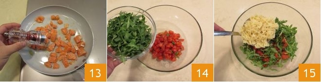 mix everything well 16, finally add the salmon and your farfalle with salmon, arugula, and cherry tomatoes are ready to be enjoyed! 18