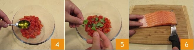 the extra virgin olive oil 4 and the fresh basil, torn into pieces 5. Take the salmon fillet and with a knife remove the skin, trying not to cut away the flesh 6,