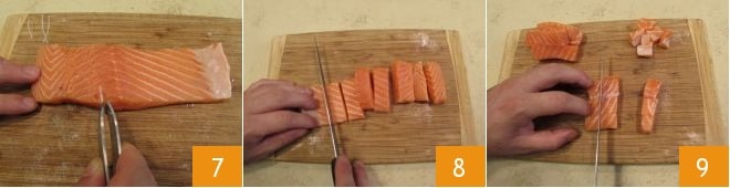 then with the help of tweezers remove any bones present. Then cut the fillet first into strips 8 and then into chunks of about 1x1 inch 9.