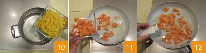Cook the pasta 10 and in the meantime in a pan with a drizzle of oil, sauté the salmon 11 for no more than 2 minutes on each side, then add the salt 12,