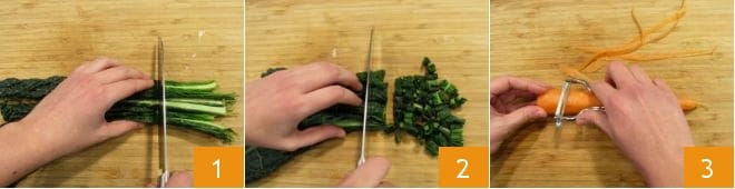 To prepare the Lucchese chickpea flatbread in jar-cooking, start by preparing the Vegetable broth. Then wash and clean all the vegetables, remove the tough part of the kale leaves' stems 1 and cut the leaves into pieces of about 0.75-1 inch 2. Peel the carrots 3