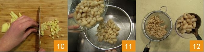 then cubes of about 0.3 inch 10. Set the vegetables aside. Drain the beans from their preservation liquid 11 and take half of them to transfer into a blender 12.