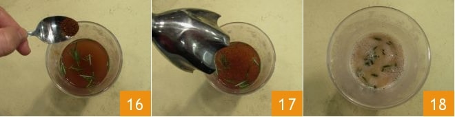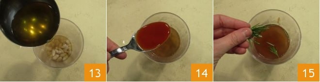 Add about 4 ladles of hot broth 13, 2 tablespoons of tomato puree 14, a few rosemary needles 15