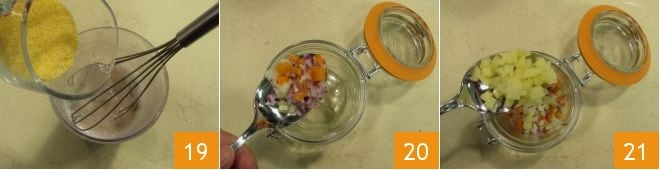 Now add the flour gradually 19 and mix well. You can now assemble the jars (use new jars with airtight lids and a rubber seal): pour some vegetables (celery, carrot, onion) 20 into each, a few potato cubes 21,