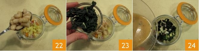 some whole beans 21, a bit of Tuscan kale 21 and cover to the brim with the bean broth and cornmeal mix 24.