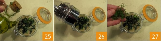 Finish with a drizzle of good oil 25, a sprinkle of pepper 26 and a few sprigs of wild fennel 27.