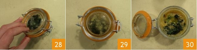 Tightly seal the jars 28 and cook in the microwave at 450 watts for about 5-7 minutes (it depends on the cut, how tough the vegetables are, and the jar used). Once ready, let them rest for a couple of minutes 29 before opening; to open, hold the jar lid with one hand and pull the rubber seal tab with the other. Enjoy the Lucchese chickpea flatbread in jar-cooking 30!