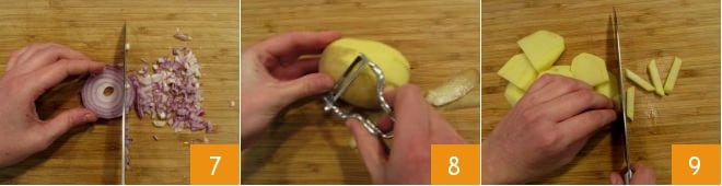 Then clean and chop the red onion 7. Peel the potatoes 8, cut them in half and from each half first obtain slices, then sticks 9