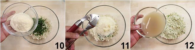 the Grana Padano PDO 10, the crushed garlic 11, and the pepper: mix well with a spoon, blending everything with two tablespoons of oil. Finally, gradually add the fasolari juice 12,