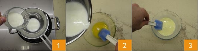 To prepare the Fassona tartare with savory custard, start with the custard. Heat the milk and cream in a double boiler until it almost boils 1. Then turn off the heat. Meanwhile, break the egg yolks (from about 4 medium eggs) into a bowl and add the warmed liquids 2. Stir well 3