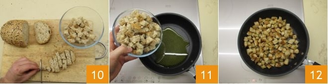 Move on to the croutons to accompany your Fassona tartare: slice the bread (we chose a rustic Tyrolean bread, but feel free to choose your favorite) and cut into cubes about 1/4 inch 10, toss them in a pan with some oil 11 and sauté over high heat, shaking the pan often, until they become golden; set these aside as well 12.