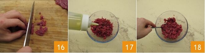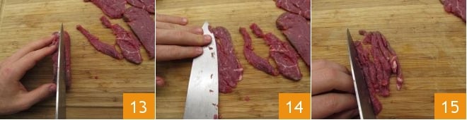 Finally, take care of the meat. Thinly slice the Fassona fillet (the meat must be very fresh) 13; if necessary, you can also remove any fat strands, then flatten each slice with the back of a knife 14. Cut the slices into strips 15