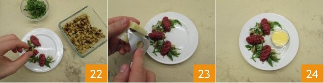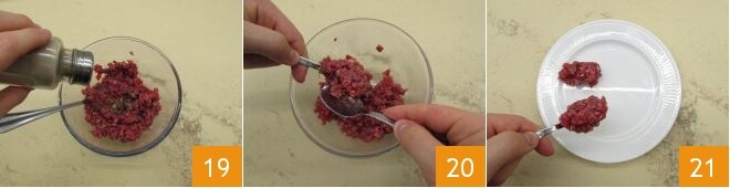 Then you can season with salt, thyme, and pepper 19. Stir again, and finally, move on to plating. With two spoons, shape the tartare into quenelles: just scoop some mixture and shape it with the two spoons, passing it back and forth to form oval mounds 20. As you go, place the quenelles on the plate 21,
