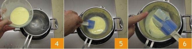 and return to the double boiler 4. Keep stirring continuously while waiting for the temperature to reach 180°F 5. For accuracy, it is highly recommended to use a kitchen thermometer. At the end of cooking, you can check if it is done by running your finger over the back of the spoon. If the two parts remain separate, meaning the top doesn't run downwards, then the liquid mixture is perfectly cooked 6.