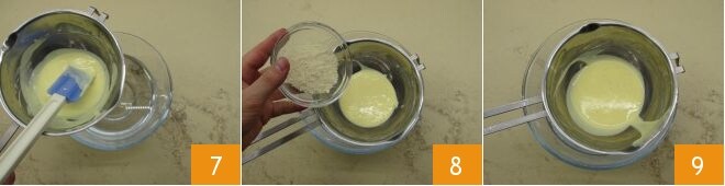 Transfer the double boiler to a bowl with ice water to stop the cooking 7 and immediately add the grated Parmesan 8, salt, and pepper. Stir well to melt the cheese and set aside your savory custard 9.