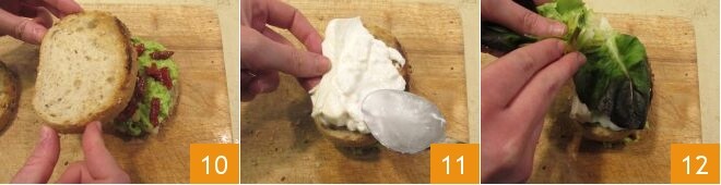 place half of the sundried tomatoes on top and close with another slice of bread 10, spread half of the burrata stracciatella on top 11, lay a few previously washed and dried salad leaves 12
