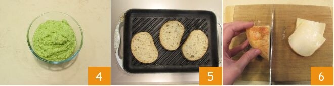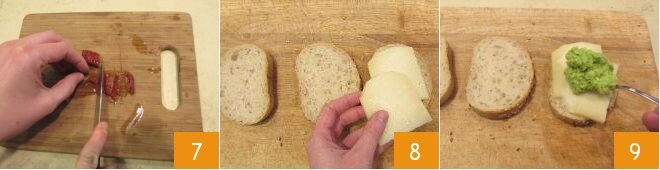 to obtain a puree 4. Now toast the bread slices on a grill on one side only to make them just crispy 5. You will need 3 slices of bread for each sandwich. Also, slice the Pecorino thinly 6 and remove the rind from each slice