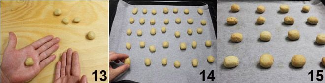 begin kneading with your hands 10 until you obtain a compact and moldable dough 11. Cut off one piece of dough at a time and roll it into a sausage shape with a diameter of approximately 3/8 inch, then divide it into pieces also about 3/8 inch wide 12.