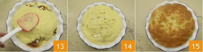 pour a little less than half of the dough onto the bottom, spreading it so that it covers the entire surface 10. Now add the filling of leftover gratinated fennel 11 and 2/3 of the scamorza 12.