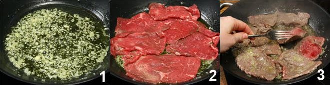 In a large pan, heat the oil and butter, add the crushed garlic and chopped shallot 1, let them soften (it will take about 15 minutes) and then add the slices 2. Brown the meat, first on one side then on the other 3,
