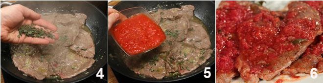 then add the thyme and marjoram 4. Let it flavor and pour in the tomato pulp 5. Cook everything for 5 minutes on high heat, and when the tomato has thickened, adjust with salt and pepper and then turn off. Serve the slices with tomato, thyme, and marjoram well drizzled with their cooking sauce 6.