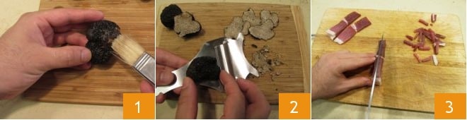 To prepare the pasta alla modenese, start by handling the truffle: clean it with a little brush 1 and slice it with the appropriate tool 2, then set it aside in a small bowl. Cut the raw ham into strips about 1-1.5 inches long 3.
