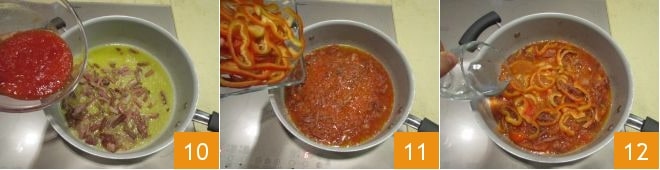 Let it flavor for a couple of minutes, add the chopped tomato pulp 10 and the bell peppers 11. Season with salt, pour in the water 12, and let it cook for about 20 minutes, stirring occasionally.