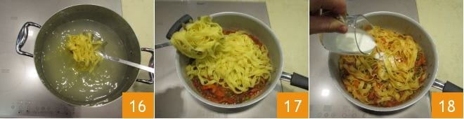 Drain it well al dente 16 and pour it directly into the saucepan with the sauce 17. Add the cream 18, a pinch of pepper