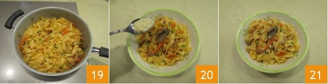 and mix everything to blend the ingredients. Garnish the dish with grated Parmesan 20, a few slices of truffle, and serve your fettuccine alla modenese 21.