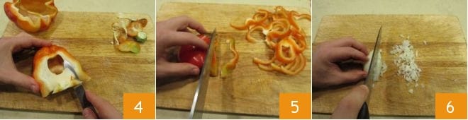 Next, handle the bell pepper: wash it, cut it in half, remove the internal filaments 4, and cut it into strips about 1/5 inch wide 5. Peel the onion and finely chop it with a knife 6.