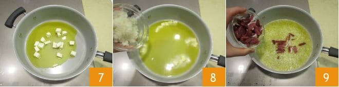Pour the oil and cubed butter into a saucepan 7, turn on the heat, add the onion 8, and let it soften over moderate heat for 5 minutes, then add the ham strips 9.
