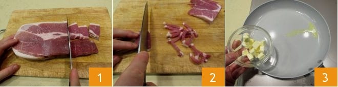 To prepare Fettuccine alla Papalina, first cut the prosciutto into slices 1 and then into strips 2. Place a non-stick pan over the heat and melt the butter cut into pieces 3.