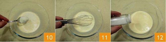 Add the grated cheese 10, mix again 11, and finally adjust the salt 12.