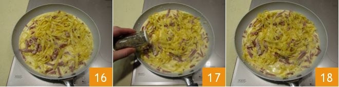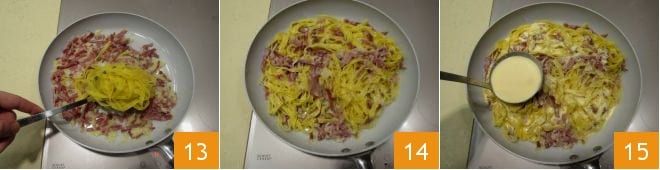 After the necessary time, drain the fettuccine and pour them directly into the pan with the sauce 13, tossing for a few moments to flavor; turn off the heat and add the egg-based mixture 14, distributing it evenly over the pasta 15.