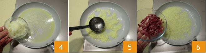 Let the finely chopped onion soften in the butter for 8 minutes 4 by adding a ladle of water at room temperature 5. Add the previously sliced prosciutto strips 6 and