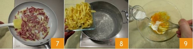 mix with a kitchen spatula 7, cooking for another 2 minutes. Once ready, turn off the heat and set aside. Put a pot with salted water on the heat and bring to a boil, then cook the fettuccine al dente for 3 minutes 8; meanwhile, crack the eggs into a bowl and add the cream, mixing vigorously with a whisk 9.