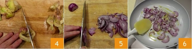 then cut the artichoke hearts in half, remove the inner choke, and cut them into quarters 4. Clean and slice the red onion into julienne strips 5 and sauté it in a large pan drizzled with olive oil 6.